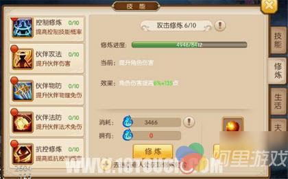 能大幅度提升主角和伙伴的战力。修炼技能上限一共有20级,随着人物等级提升而开放更高的修炼等级,修炼等级越高效果越好,通过消耗修炼经验来升级。