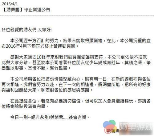 据悉,《劲舞时代》于2006年在台湾推出,至今已经运营10年的时间。然而,因思锐选择在愚人节当日发布停运公告,称“本公司经千方百计的努力,结果未能取得续营权,在此本公司沉重的宣布2016年4月下旬正式终止运营劲舞时代”。