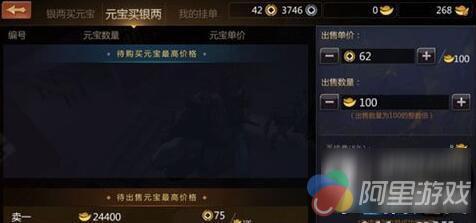元宝买银两:侠士可以将本人的不绑定元宝进行挂售,右侧可设置元宝的单价与数量。此页面优先显示“银两买元宝”市场当前最高的5个出售元宝单价,以供对比参考。