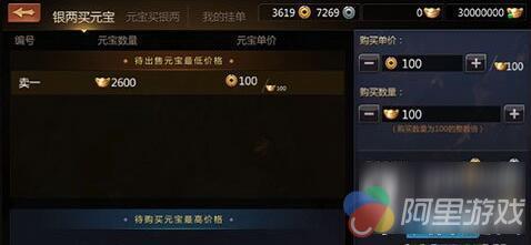 银两买元宝:此页面优先显示“元宝买银两”市场当前最低的5个出售元宝单价,以供对比参考。侠士可选择合适数量、单价的挂单进行购买,消耗银两换取元宝。