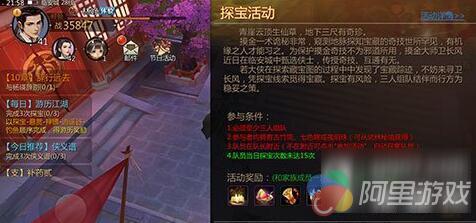 玩家前往探宝活动地点可以看到活动介绍中说明了玩家要参与活动必须拥有古竹简、七色棉和夜明珠之一才可以。其中古竹简是初级探宝道具、七色棉是中级探宝道具,而夜明珠是高级探宝道具。玩家组队完成开启任务之后会让每名成员提交一份道具,提交的道具整体级别越高,最后获得高级奖励的可能就越大。