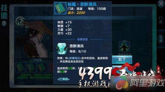 当少侠达到40级,将在众多秘籍中选取一本,通过屏幕右下角技能里面的公共栏装备你的第一本秘籍。建议少侠可以选择<悲酥清风>,因为此秘籍依附的技能为逍遥派主要控制技能<风卷残云>,既能对目标造成造成浮空,还能造成大量伤害,是少侠在发展期群战、副本的不二选择。