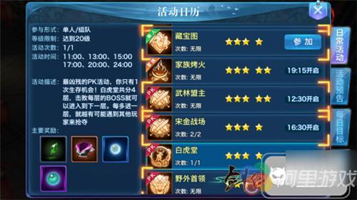 每天白虎堂开启6次,时间分别是11:00、13:00、15:00、17:00、20:00和24:00,每次持续半小时。大家可以通过活动界面进入白虎堂,白虎堂共有8个入口,大家可自由选择。白虎堂副本极致凶残,每个玩家只有一次生存机会,所以强烈建议组队前往,可以单人进入后组队,或者组队后再前往。