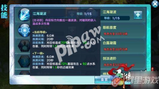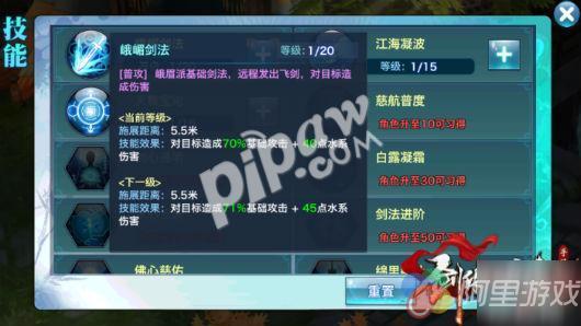 峨嵋派基础剑法,远程发出飞剑,对目标造成伤害。峨嵋剑法的攻击距离为5.5米在在游戏中属于中距离的攻击范围,附加水属性的伤害。由于是普攻技能小编建议优先点满。