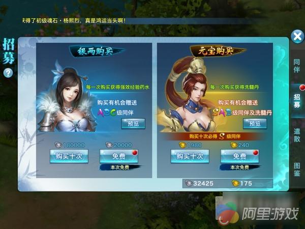 想必接触过十连抽的玩家都知道,十连抽共分为银两购买和元宝购买两种,而银两购买每一次必定获得强效经验药水,伙伴方面则会随机获得 A、B、C 三个等级的伙伴。元宝购买则每一次必定会获得洗髓丹,随机获取 SS、S、A、B、C 级的伙伴。虽然用元宝招募满 10 次后必定获得一个 S 级的伙伴,但用十连抽可以少花 420 个元宝,因此如果玩家想进行十连抽的话,选择这一方式会更加划算。