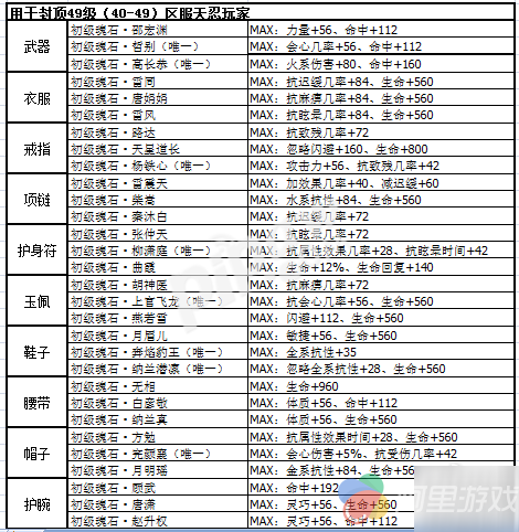 二、40级到49级天忍魂石各部件推荐:
