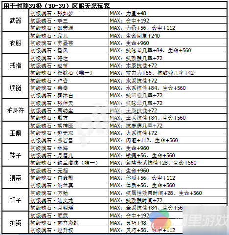 一、30级到39级天忍魂石各部件推荐: