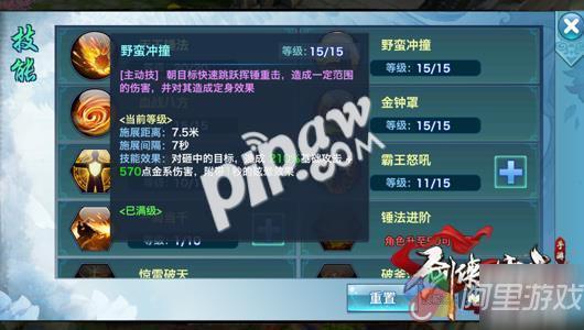 天王锤法[普攻]:攻击身前小范围的目标,对目标造成一定基础伤害+地系伤害,有效距离200。普通攻击一般都是一个职业最基本的技能了,几乎没有CD时间,必修技能之一。