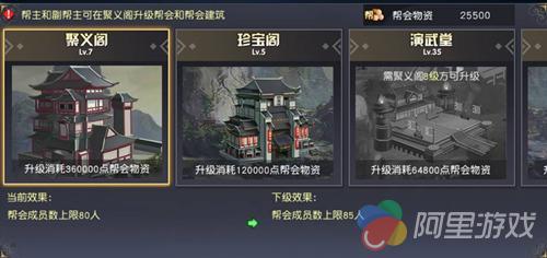 聚义阁升级可以提高帮会的人员上限和其余建筑等级上限