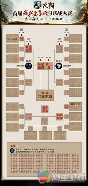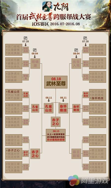 本次跨服帮战决赛分为两大战场,分别是iOS平台的孔雀山庄、赤子之心和身怀绝技三大服务器最强帮会对垒;安卓平台的风起云涌、青云堡、慕容世家服务器光明顶之主帮派对战。根据茗剑阁记者传回来的情报来看,iOS平台三大帮派的战力、武学、内功修为和实战技巧都相对十分娴熟,并且各大帮派云集了数十个拥有古谱武学的玩家,在跨服对战中更考验出手的时机和手段;而安卓平台的三大帮派虽然能力也非常突出,但相对的古谱玩家数量、武学内功修为都不算太高,对战的比拼更考验策略、布阵技巧等,想要脱颖而出必须要以雷霆手段占据光明顶决胜之地,方可成功晋级。