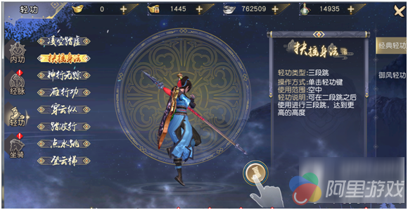 2、每种御风轻功都有不同的表现动作以及效果。游戏中目前有3种御风轻功,可以在游戏中的修炼-轻功界面进行查看