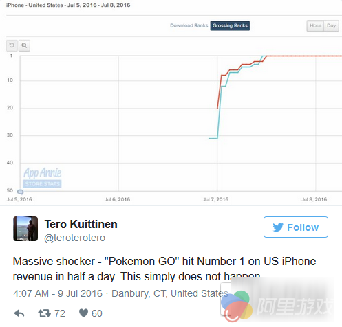 《精灵宝可梦 GO》美国iOS版上线半日内,已经位居游戏最大收益榜榜首!Niantic预期这款游戏会十分受欢迎,但是仍未预估到精灵宝可梦IP结合其独特AR/地理定位玩法造成的爆炸性效应。由于预估不足导致服务器未做好充分准备,游戏也需要进行相应优化。公司正联合任天堂和制作公司日以继夜的全力修复问题。