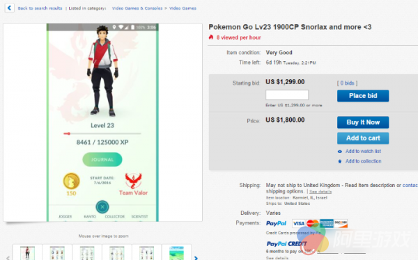 虽然这样的天价不多见,但eBay上《精灵宝可梦GO》的账号交易整体已经非常火爆,还有一个把账号卖到1800美元的玩家在描述里写到:游戏很棒,过去的两周半我玩的非常开心。但是为了工作和学习我不能再玩下去了。