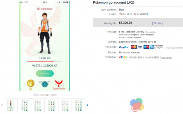 《精灵宝可梦GO(Pokemon GO)》在推出之后,有不少懒人玩家在想各种各样不出门就能抓宠孵蛋的办法。不过直接买号显然比任何手段都更加直接。最近在英国的eBay上出现了一个23级的《精灵宝可梦GO》账号,该账号中有大量CP值较高的稀有精灵,最终竟然拍出了7300英镑(约64000人民币)的天价。