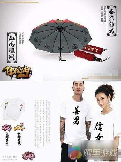 手游《佛陀传》还未上线呢,就开始卖起了周边。刚开始还以为这款手游是拿了小说或者影视的 IP ,然而并没有,而且参展 CJ 也是它的首次亮相。这手游的品种还不少:情侣 T 恤、雨伞、台灯、折扇。它们的基本特点就是——在这些日常用品上加几个看上去贴近主题“佛”的字样,或者是印个 Logo 就完了。