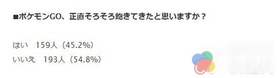 近日,有日媒针对《精灵宝可梦:GO》做了一项市场调查,但出乎他们意外的是,本作上线才半个月左右,就已经有不少玩家表示对《精灵宝可梦:GO》厌烦了。在此次调查中,总共有352名大学生玩家参与,其中有159人(占比45.2%)表示已经玩腻了,另外193人(占比54.8%)则表示还有兴趣玩下去。