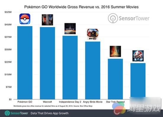 移动应用数据分析公司Sensor Tower近期公布了一份最新的手游报告,其中特别提到《精灵宝可梦GO》截至目前全球累计收入已经突破了4.4亿美元,约合人民币29.39亿。自7月6日上市起,截止目前已经上架了两个月,游戏发行商Niantic的净收入达到了3.08亿美元,较上月增长1亿美元。而在对比图中,《精灵宝可梦GO》在今夏的疯狂吸金甚至超过了好莱坞大片,比如票房高达4.34亿美元的《魔兽》以及票房达到3.83亿美元的《独立日:卷土重来》等等,图表如下: