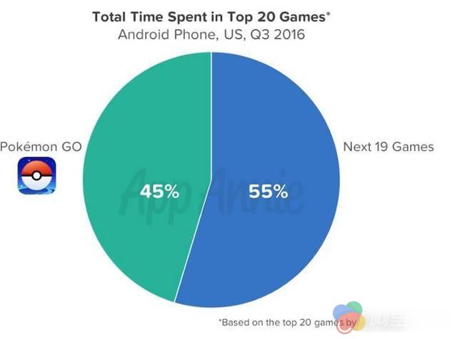 与此同时,App Annie表示在第三季度美国收入最高的前20款安卓游戏中,玩家体验《精灵宝可梦Go》的时长占比达到了45%,几乎接近另外19款游戏占据玩家的总时长。
