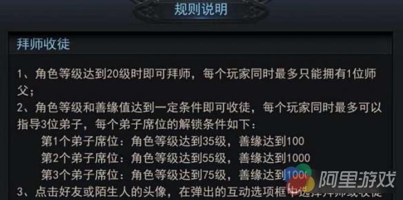2.角色等级和善缘值达到一定条件即可收徒,每个玩家同时最多可以指导3位弟子;
