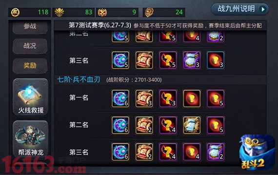 战九州玩法的奖励,分为个人奖励和帮派奖励两部分:首先,参与帮派争霸的成员,可以通过战斗过程中的驻守和进攻,获得烽火令及帮贡奖励,其中烽火令可用于兑换宝箱;其次,系统会根据帮派在当前赛季的表现,向帮派颁发集体奖励,这一部分奖励可由帮主自由分配。