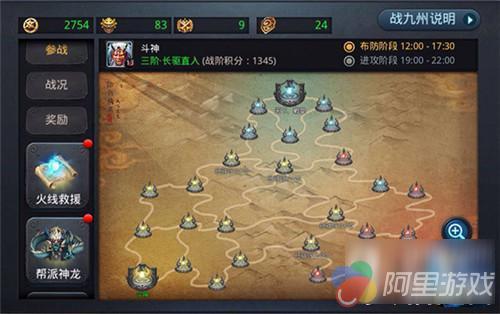 《乱斗西游2》全新推出的战九州,是一项以帮派为单位的三方GVG玩法:由系统跨服随机匹配的三大帮派,,围绕遍布全图的27个据点展开攻防大战——在单位时间内,占有据点数越多的帮派积分越高,而单赛季的比赛胜负则完全取决于累计积分的高低。