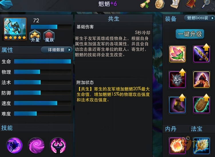 共生:寄生友军身上,根据自身属性来强化友军的各项属性,可增加魍魉15%的物理法术强度到友军身上。