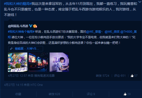 近日在IET义乌国际国际电子竞技大赛上,手游项目《乱斗西游》挑战赛进行的如火如荼之时。发生了一起惊爆眼球的大事件:一位通过层层赛事选拔的校园小鲜肉选手,通过微博放出狠话:“我的大学专业不是电竞,但我就是来打败大神的!