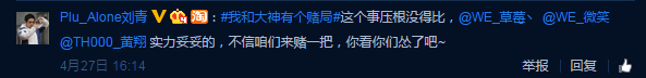 此事在微博上一经曝光,引起了电竞圈内的的专业人士疯狂转载,众多名人大V纷纷转发,其关键话题词“#我和大神有个赌局# ”更是跻身微博当日前十的话题。更加有趣的是,当初放狠话的小鲜肉选手最后成功杀入了决赛,而他的对手则是击败了WE.微笑,当今WAR3项目最优秀的随机种族选手——TH000,蛋总是也。