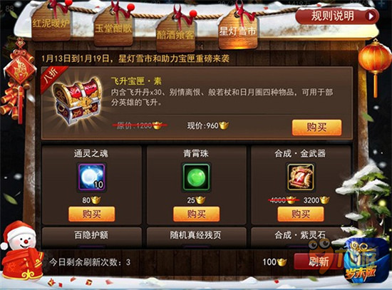 和拆箱的惊喜体验一样,《乱斗西游2》中也从来不缺让人剁手买买买的优惠活动,随醅酒飨客同步开启的“星灯雪市“,正是其中之一:活动期间,星灯雪市将以超低折扣优惠,出售包括助力宝匣、装备、配方、强化石、注灵材料、紫魂印在内的各种珍稀道具。助力宝匣附赠的丰富材料,可用于英雄飞升、元神突破、元神强化、以及洗炼注灵等多项养成系统,是玩家养成新英雄的最佳助手。