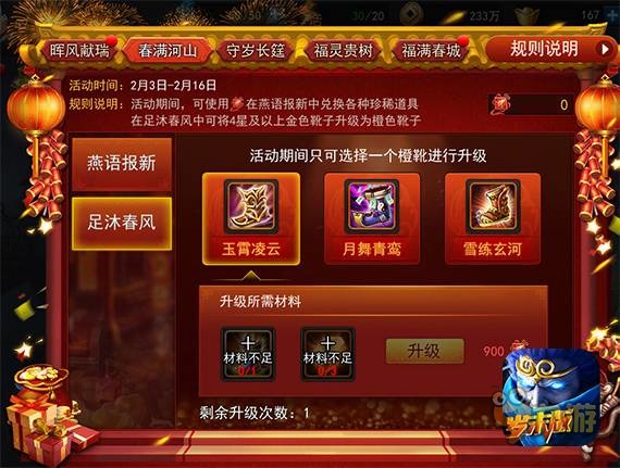 此外,各位玩家还可参与“晖风献瑞“活动获得岁华结,使用岁华结在”春满河山“活动中兑换金鞋子和全新四星英雄业火明王、黄眉老佛,更能足沐春风,获得橙色套装鞋子!年近岁末,告别羊年辞旧岁,海量福利等你来!