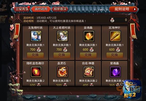 杏花雨过胭脂绰,人间喜乐鸣社鼓。3月30日至4月12日活动期间,使用杜康酒即可在画桥疏雨活动中兑换金色武器定海神针、福禄宝箱各类珍稀道具。考验RP的时刻到了,想知道4月最新运程?不用翻黄历、不用看星座,直接来《乱斗西游2》参与画桥疏雨活动,揭开福禄宝箱神秘面纱,魂印、装备、灵石,助你乱斗路上战力值爆表,每次打开还有五个杜康酒返还!