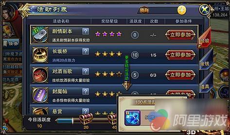 因此在接了任务之后,可以直接点击左边的任务栏一一放弃任务,再重新接取,瞬间就能获得活跃度。副本如宝库、偏殿等也是一样,进入副本后直接退出就可以了。因为小号不需要任何资源,体力更不需要花在八阵图上,所以体力是不缺的。