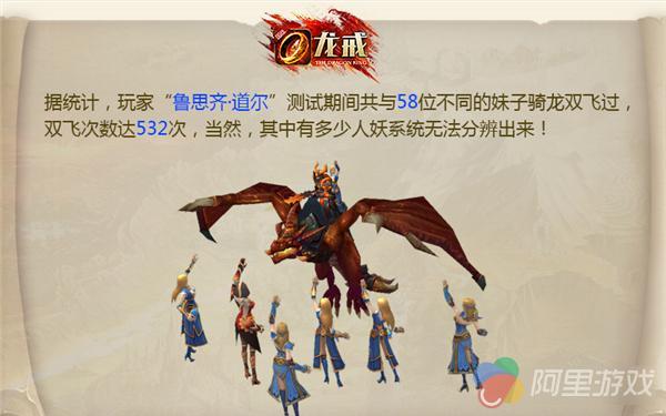 有了一匹可双人骑乘的坐骑,但你还少一个肯与你双飞的妹子?来看看这位仁兄是如何利用双人坐骑把妹的。据统计,玩家“鲁思齐·道尔”测试期间共与58位不同的妹子骑龙双飞过,双飞次数达532次,当然,其中有多少人妖系统无法分辨出来!