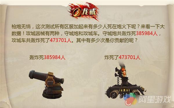 枪炮无情,这次测试所有区服加起来有多少人死在炮火下呢?来看一下大数据!攻城器械有两种,守城炮和攻城车。守城炮共轰炸死385984人,攻城车共轰炸死了473701人。其中有多少次是你贡献的呢?