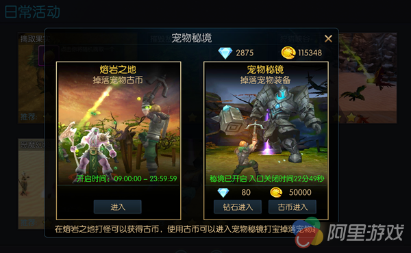 如果你的时间不多,可以选择消耗钻石进入宠物秘境,而时间多的玩家可以刷古币进入节省钻石消耗。古币会一直保留不会每日清零,如果没有时间可存古币到空闲时间再刷秘境,并没有任何影响,时间安排较为灵活。