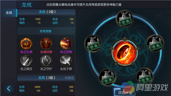 技能又分为两种,一种是不可升级的技能,比如技能“龙之礼物”;另一种是技能可以继续升级,不同的技能升级条件要求也不同,比如有服用龙魂才能提升技能等级,也有随着戒指提升到一定等级技能也会升级等不一样的条件。