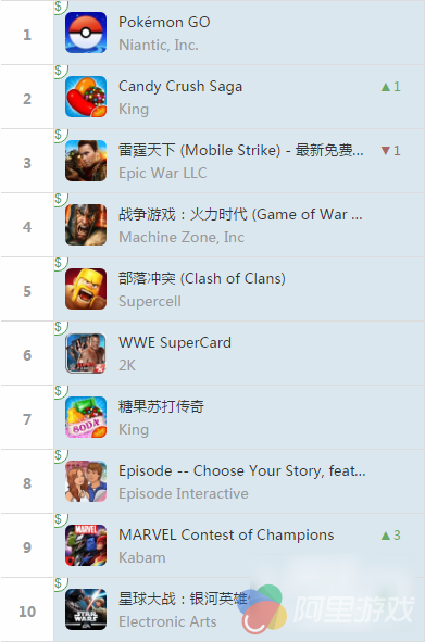欧洲方面,《精灵宝可梦Go》继续保持第一位,《糖果粉碎传奇》今天占据了第二名,《雷霆天下》《战争游戏》排在第三第四,《部落冲突》保持在第五位。《WWE Supercard》回到榜中,目前排在第6名,《星球大战》同样在榜,目前排在第十。