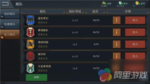 打开舰队列表,寻找自己心仪的舰队以求加入,是大多数刚刚达到舰队系统等级门槛的舰长们会选择的内容。在“加入舰队”页签中,咱们能够看到当前服务器内所有舰队的状态,包括了舰队名称、舰队徽章、舰队等级、舰队成员数等参数,只需要点击加入按键,在等待舰队司令批准后即可加入舰队。