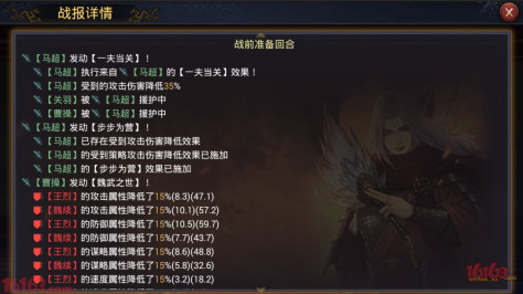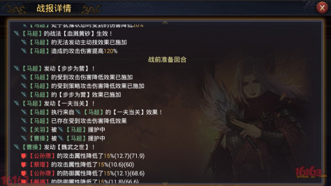 这张战报,马超佩戴战法顺序从上到下,依次为步步为营和一夫当关,所以战法发动的顺序也为先发动步步为营,再发动一夫当关。图中可以看到,步步为营发动之后,再发动一夫当关,则显示已存在受到攻击伤害降低效果,这里请大家注意,步步为营战法效果为受到所有伤害降低效果每回合递增,1级效果只为降低4%,而一夫当关战法效果则为前2回合受到攻击伤害降低,1级效果为降低35%,所以步步为营的降低受到攻击伤害降低效果,全程覆盖了一夫当关的受到攻击伤害降低效果,虽然一夫当关效果比较高。