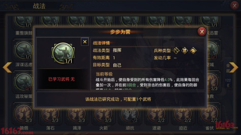 大家请注意,这两个战法都为指挥战法,但是一夫当关的效果为只降低自身受到的攻击伤害,而步步为营的效果则为降低自身受到的所有的伤害,包括受到的攻击伤害和受到的策略攻击伤害,所以二者使自身受到攻击伤害降低的效果,冲突了!
