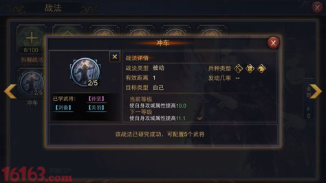 需要注意的是,战法的选择不仅仅是为了提升武将自身的能力,还要兼顾与武将所携带兵种的搭配。有的战法可以兼顾所有兵种,而有的战法则只能对应特定兵种,如果选择失误,则战法无法结合兵种发挥出应有的能力。浪费一次学习机会事小,无法在战斗中发挥出足够的威力,那可就得不偿失了。