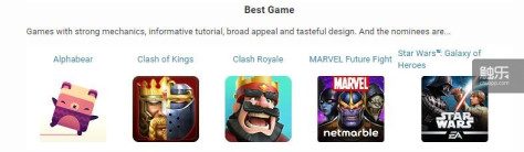 以及最重要的,最佳游戏奖(Best Game),获提名的有《Alphabear》《列王的纷争》《皇室战争》《MARVEL Future Fight》《Star Wars™: Galaxy of Heroes》。