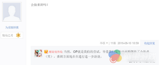 “OP就是我们的尝试,毕竟我们是做动画顺便做了个游戏(笑),番剧方面现在在进行进一步洽谈。”