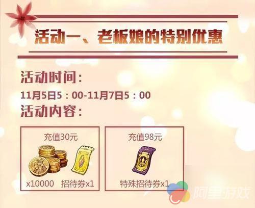 充值30元:酒馆老板娘的招待券*1,金币10000
