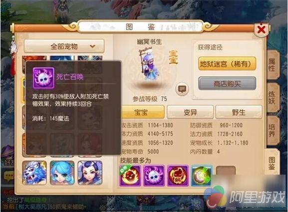 死亡召唤技能是75级参战召唤兽幽冥书生的特殊技能,如果其它召唤兽想要拥有此技能只能与其进行炼妖合成,在学习兽决方面建议学习增强自身抗性的兽决,毕竟它拥有一个让对手闻风丧胆的死亡召唤技能,因此在对战中很容易成为对方第一个点杀的目标。其次是考虑让其学习一本敏捷来提升自身的速度,这样能快过己方的输出门派出手,让对方目标单位命中死亡禁锢后再进行点杀,从而发挥出它的实质效果。