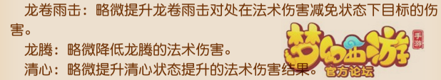 仔细分析一下这个设定使得“罗汉开出来我就不怕你们了”的打法被龙宫狠狠压制,所以龙宫并没有大削弱,而是变相提高龙宫在面对各种局面的能力,也就是最原始的门派特点:稳定的面伤法系门派。当然,肯定有玩家说,我就是喜欢变小白龙龙腾,我就是不爱用清心,那你就只好接受自己被削弱的事实了。