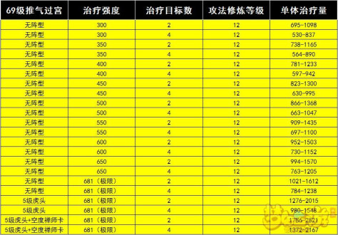治疗目标=6时,公式为:技能等级*2.75+攻法修炼等级*5.55+治疗强度*0.466