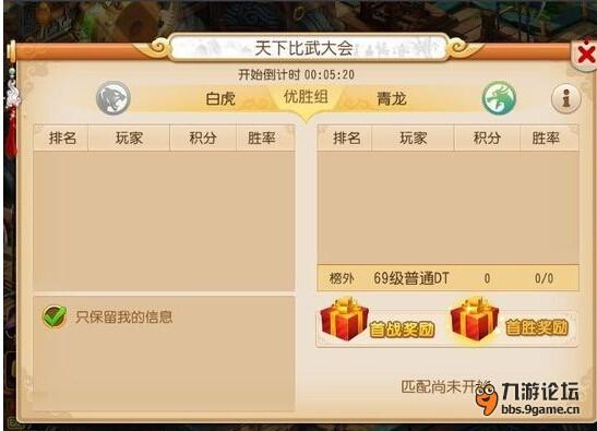 玩家分组:等级达到50级的玩家都可以参与比武大会,在20点以后玩家单人进入比武大会会场,入场之后会随机分在两个阵营,青龙和白虎。之后玩家就可以随机组队参与了,组队玩家必须为同一个阵营。
