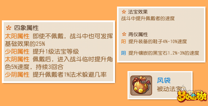 风袋:战斗中提升佩戴者的速度。方寸的标配法宝,高速方寸必备。四象属性建议选择少阳,提升1级法宝等级。一般高端pk都要打很久的,持久的高速才有用。如果没信心拿一速的情况下强烈推荐少阴,提升1%法术躲避相当于增加抗封。