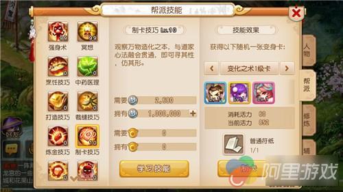 只要你的等级≥69级,你就能够在帮派中学习新的帮派技能:制卡技巧,随着你制卡技巧等级的提升,你可以制作的变身卡也越多,而在每次制作变身卡的过程中,你需要消耗各种不同等级的符纸和活力。在获得变身卡之后,你就可以自己使用这些卡片,或者将其直接挂到摆摊上出售,让自己用不到的变身卡,也能找到合适的主人!